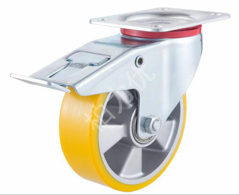 定向锁定万向脚轮顾名思义既该轮子可以万向转动又可以锁定,该轮子特点是在工作时可以360度方向旋转及转向,其转动灵活特点非常适合多角度转动的设备,台车便于作业增加效率,在需要固定原位置作业时可以将轮子锁定,其设备及台车等移动物体又可以固定原位置不移动,该万向锁定轮也是英寸为单位计算产品直径,其轮胎为聚氨酯材质,在频繁转向中,耐磨性能非常好,不会因为频繁作业转向而磨损